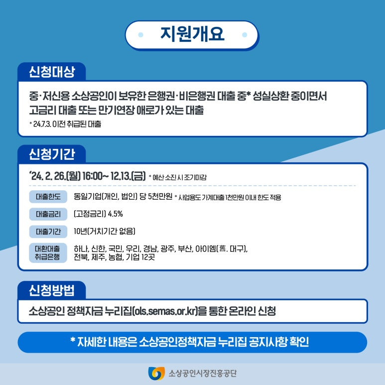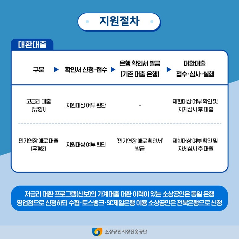 - 대출 조건: 신청자는 고금리 대출(연 7% 이상) 또는 만기 연장에 어려움을 겪고 있는 대출을 보유하고 있어야 합니다. 또한, 해당 대출금을 3개월 이상 성실히 상환 중인 경우에만 신청 가능합니다.