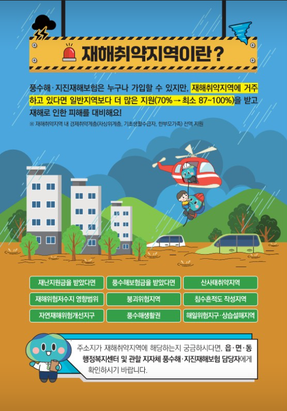 재해취약지역이란 자연재해의 위험이 상대적으로 높은 지역을 의미합니다. 이러한 지역에 거주하는 경우, 자연재해로 인한 피해를 줄이기 위해 정부에서 다양한 지원을 제공하고 있습니다. 특히 재해보험을 가입하면 일반 지역보다 더 높은 비율의 정부 지원을 받을 수 있습니다. 정부는 재해취약지역 주민들의 경제적 부담을 최소화하고자 보험료의 70% 이상을 지원하고 있으며, 경제취약계층에 대해서는 보험료가 전액 면제됩니다.